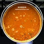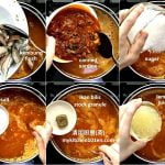 5 Bring strained stock to the boil, add in kembung flesh, canned sardine, sugar, salt, ikan bilis stock granule and lemon juice.