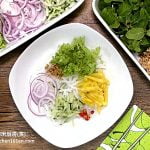 1 Put Laksa noodles in deep serving plate, top with shredded ingredients, pineapple strips, chopped ginger flower and bird’s eye chilies.