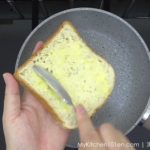 3 Toast garlic butter bread on hot pan, turn to medium heat and allow to crisp, or until it’s golden brown on both sides.