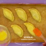 Arrange curry puffs on a baking tray lined with non-stick baking paper and brush the surface with egg wash. (For the egg wash: Mix together 1 egg yolk and 1 tsp of water, sieve through.)