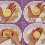 Roll out the dough into oblong shape, then roll it up. Roll out the rolled dough again, then roll it up again. Cut each into 2. Cover with cling wrap, set aside to rest for 20 minutes.