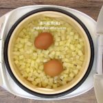 Steam Russet potato and eggs for 10 minutes, or until the potato has softened.