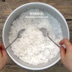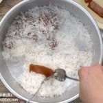 2 Add salt to steamed shredded coconut, mix well (cover to prevent it from drying).