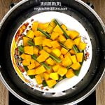 3 Steam pumpkin flesh with pandan leaves for 10 minutes, until softened.