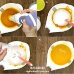 4 Blend steamed pumpkin until smooth. Add in salt, sugar, coconut milk and water, mix well.