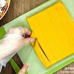 8 Unmould sweet pumpkin kuih, cut into small pieces with plastic knife.
