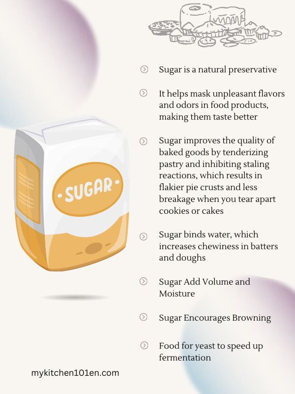 Sugar acts as a preservative, helping to extend baked goods shelf life.