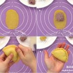 1. Flatten dough into oblong shape with rolling pin, top with taro paste filling, fold into half, seal and pleat the edges.