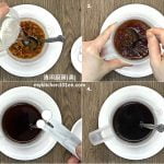 4 Add pandan infused hot water to gula Melaka, stir until dissolved. Add in baking soda, mix well. (Reminder: Baking soda is added to neutralize the acidity of gula Melaka, do not omit it. Without adding it, the surface of hee pan is not smooth.)