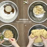 8 Sift together plain flour and glutinous rice flour, mix well. Add in cooled taro gula Melaka mixture and instant yeast, mix into a dough. Add in corn oil, knead until well blended.