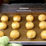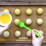 9 Arrange filled dough on a baking tray lined with non-stick baking paper, then brush the surface with egg wash. (For egg wash: Mix together 1 egg yolk and 1 tsp of water, sieve through.)