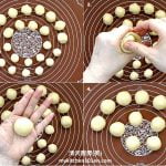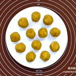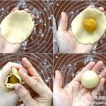 5 Divide water dough and oil dough into 12 portions. Flatten water dough, top with oil dough, fully wrap oil dough with water dough, shape into a ball.