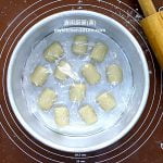- Arrange filled dough on a baking tray lined with non-stick baking paper, then brush the surface with egg wash. (For egg wash: Mix together 1 egg yolk and 1 tsp of water, sieve through.)